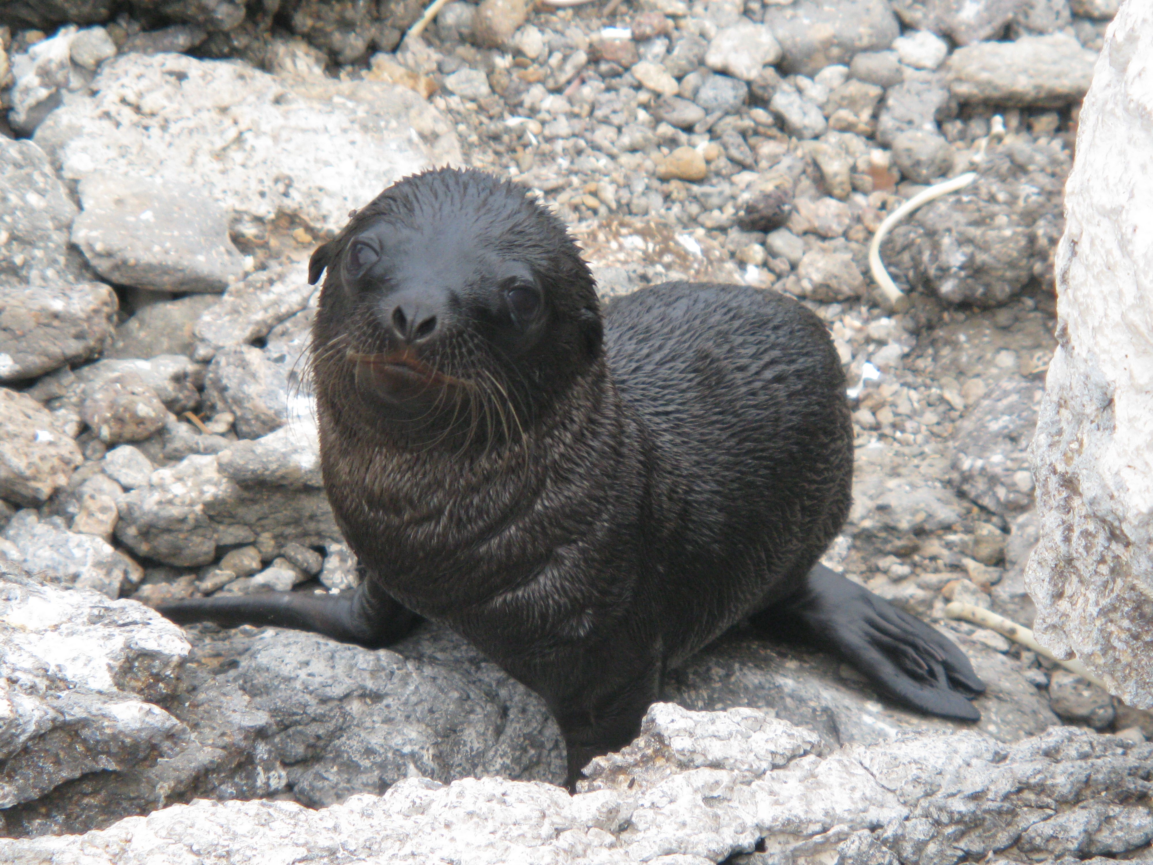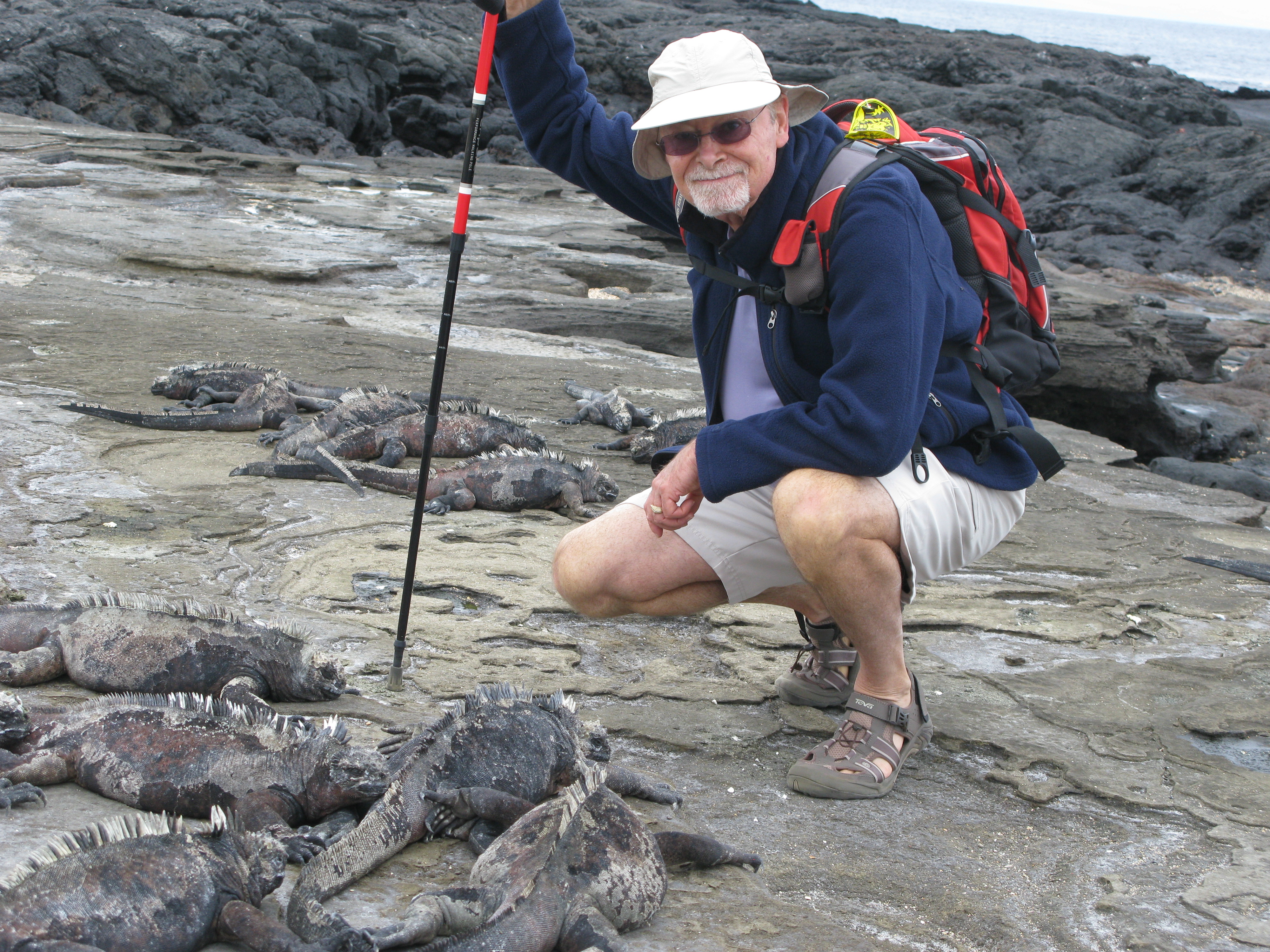 Day 2 began with a dry landing on Peurto Egas, a lava beach on Santiago Island and a hike encountering large colonies of sea lions, marine iguanas and, of course, more Sally Lightfoot crabs. The volcanic cliffs led us to a flat lava plateau, filled with tide pools and ledges near the surf, providing protected water access for the sea lions and marine iguanas. Hundreds of prehistoric looking marine iguanas appeared on the ledge, laying side by side and on top of each other, somewhat oblivious to our invasion. Aside from the occasional snort, evacuating the salt from their latest ocean sojourn to eat red and green algae and cool their bodies, they seemed somewhat lifeless. On a stakeout, we observed these lethargic creatures sunning themselves until the necessity to repeat the cycle drove them to the sea.
