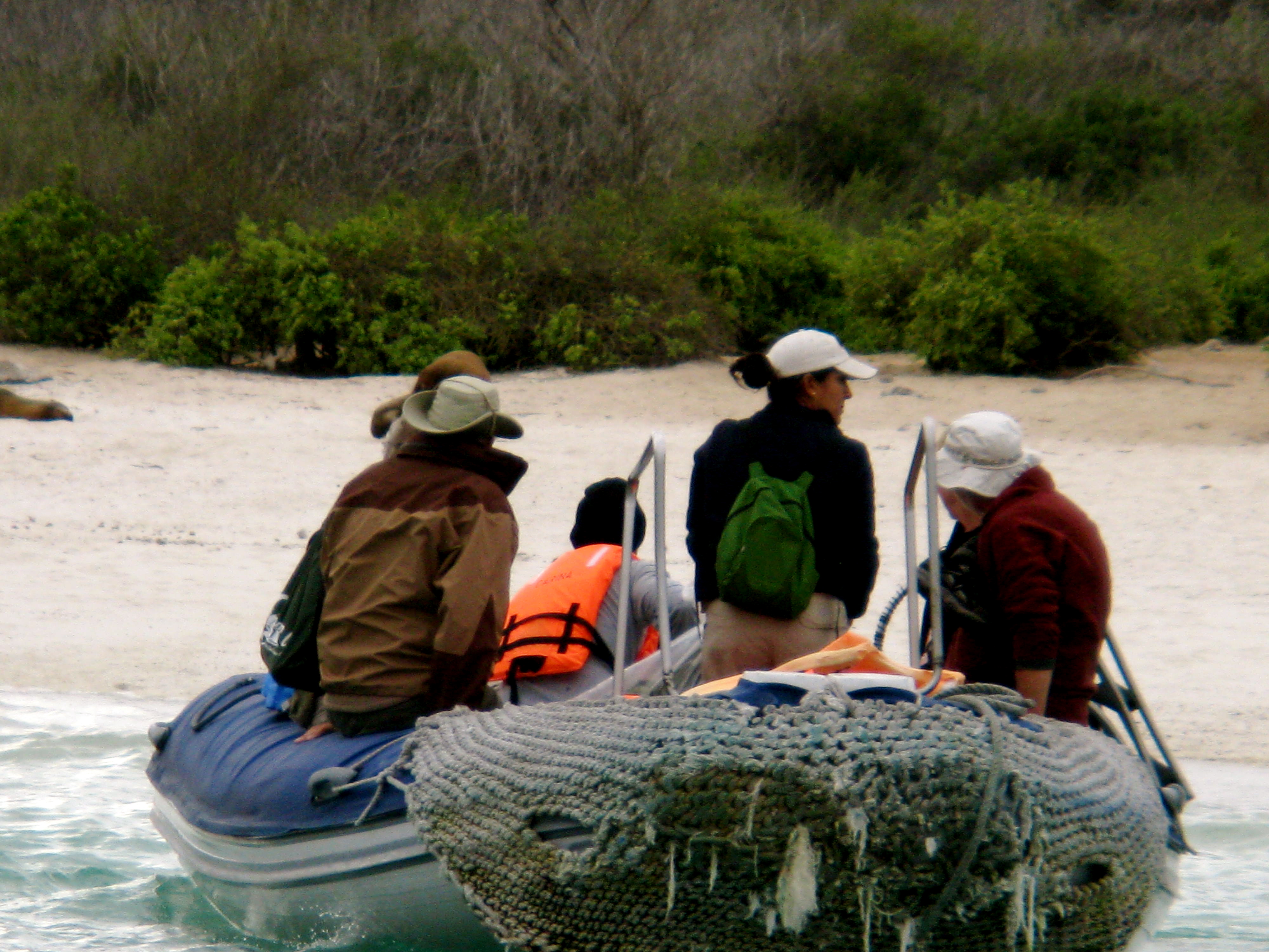 within arm’s reach. The five of us who chose to join the first dingy dive were rewarded well beyond our expectations. Back on the boat only to remove our wet suits, we re-boarded the zodiacs and crossed the inlet for a wet landing on Rabida Island