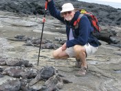 The necessity to perform the forbidden led to one memorable experience. As we departed, the bus encountered a very large tortoise resting in the middle of the road. We waited patiently for a few minutes before our naturalist, Pauli, announced that we had a boat to catch and sought volunteers to lift and relocate him. Six of us carefully, with near precision, lifted the creature and moved him several feet off the road. This experience was followed by observing, clearly the fastest moving of all tortoises. Other islands are home to the saddle tortoise, whose shell is arched to provide more reach to the Prickly Pear flower, food that hangs three to four above the ground.