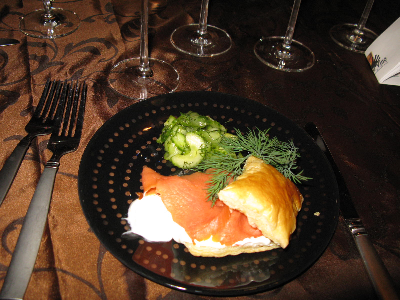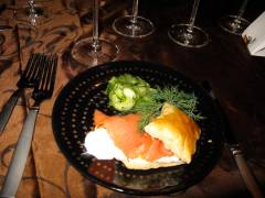 The ultimate paired wines included a fruity Val du Vino Zinfandel Paso Robles 2009 ($25) and Val du Vino Cabernet Sauvignon 2007 ($35) from Mendocino County. The cabernet, surprisingly paired with Salmon Fillets in a Cabernet Sauce served with Potato Leek Ravioli, was big and soft at the same time, the result of good balance and texture. The jammy flavors of the central coast zinfandel stood up some incredible Baked Pears filled with Stilton, Cranberries and Walnuts. What a feast, kept real with moderate portions that truly helped the expression of the wine.